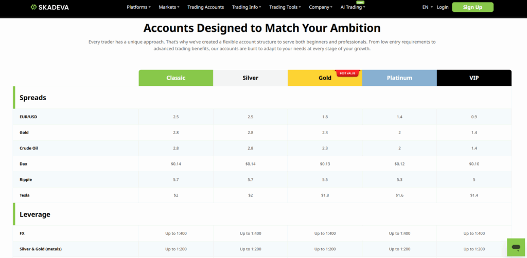 Skadeva’s balanced offering makes it particularly appealing for traders starting with smaller budgets.